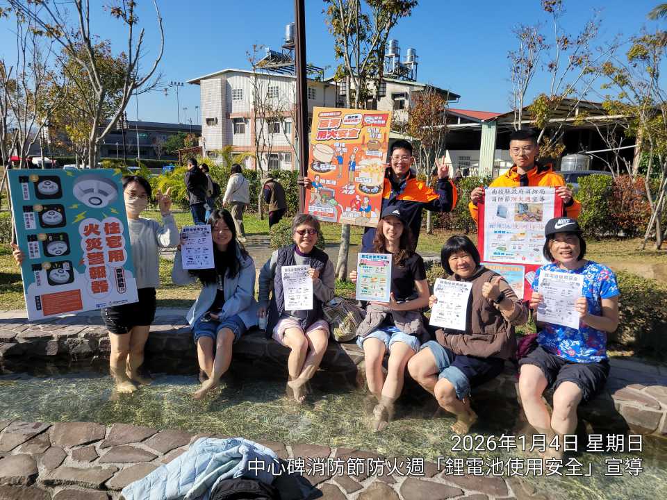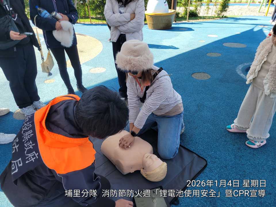 為配合防火周主題日-鋰電池使用安全,消防同仁隨即前往全台首座「埔里鎮福興溫泉主題親子共融公園」,由中心碑分隊及埔里分隊接力登場。為了讓防火知識更有趣,消防員準備了吸睛的可愛鋁箔氣球,只要認真聽講就能帶回家!現場吸引大批家長帶著孩子參與「全民CPR實作」,爸爸媽媽們在教官指導下認真練習按壓,小朋友則在旁加油打氣。透過互動同樂,讓原本生硬的急救流程,在歡笑聲中深植每位家長心中,成為守護家庭最堅實的後盾。