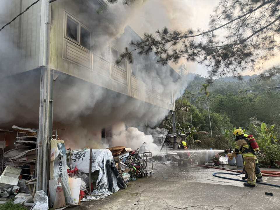由於二樓倉庫堆放大量茶葉,增加燃燒強度與撲滅困難度,消防人員改採由前方窗戶架梯進攻方式,突破火點後再輪替背負空氣呼吸器進入室內持續灌救,同時進行可燃物清除作業。