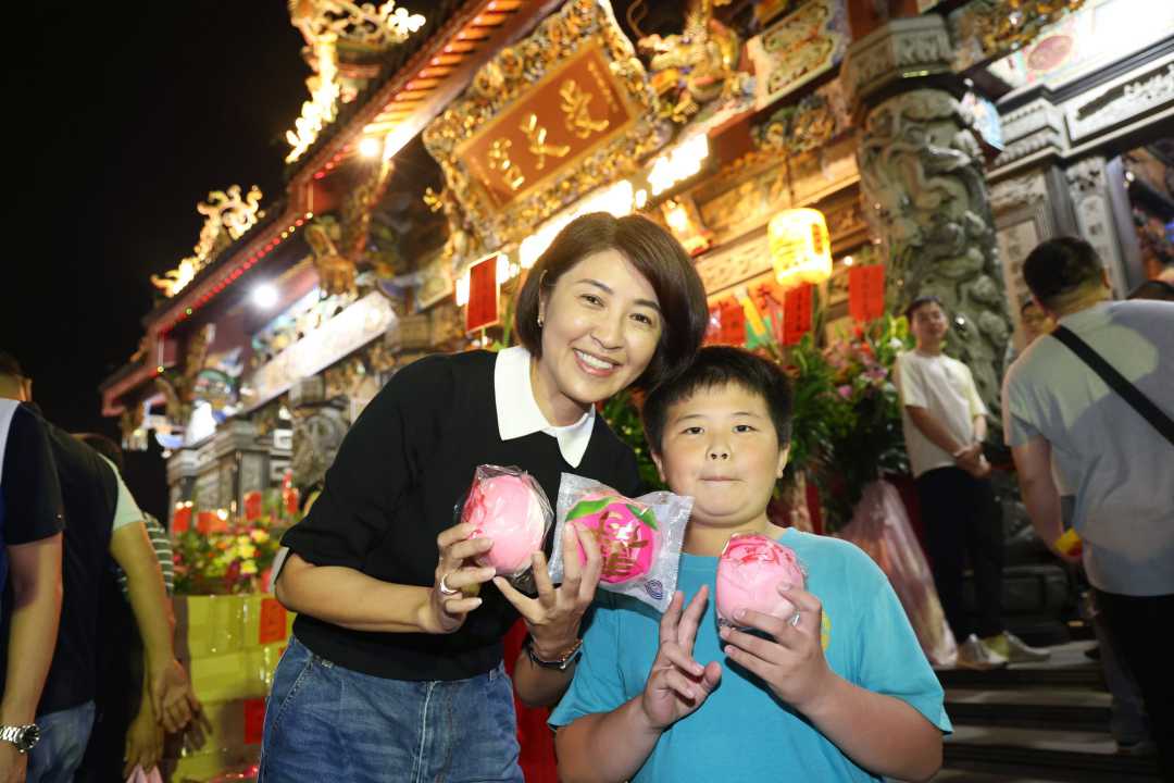 許縣長、陳主委也連袂分送萬份壽桃壽麵及限量500份的丙午年紀念錢母給大排長龍的信眾,廟方並依循古禮,為許許多多上帝爺公的契子們準備紅紗線,讓他們回宮祝壽同時,能「換絭」延續世代傳承的守護契約。