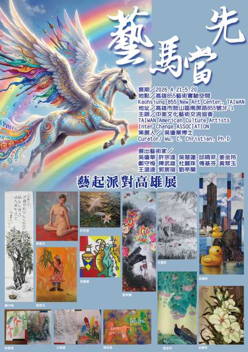 【記者 賴守正 高雄報導】在南春意盎然的四月,一場匯聚國際視野與在地情懷的藝術盛事即將在高雄正式拉開帷幕。由策展人吳瓊華博士(Wu, C. Christian, Ph.D.)統籌策劃,中美文化藝術交流協會(Taiwan American Culture Artists Inter Change Association)主辦的「藝馬當先—藝起派對」高雄展,將於2026年4月21日至5月20日,在高雄855藝術實驗空間(Kaohsiung 855 New Art Center)隆重登場。本次展覽以「藝馬當先」為核心意象,結合奔騰、啟程與跨界融合的象徵,呼應當代藝術在全球文化流動中的前行姿態。吳博士表示,此展不僅是藝術家們創意火花的碰撞,更是一種文化能量的釋放與交流,透過多元媒材與風格的交織,呈現藝術家們對當代社會、自然意象與內在精神的深層回應。