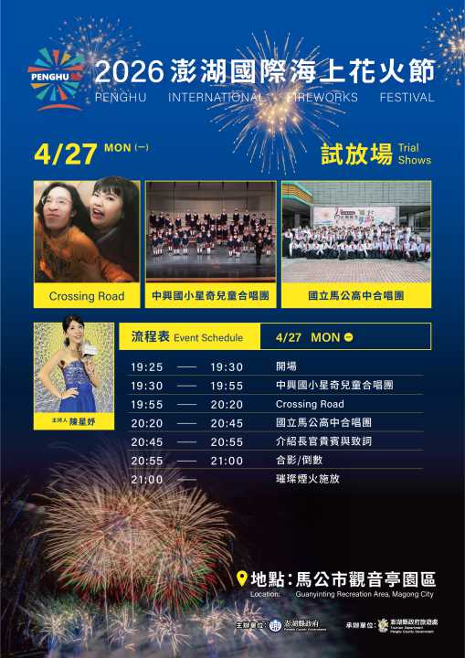 縣府表示,4月27日試放場除施放600秒的精彩煙火展演外,特別邀請澎湖在地優秀團隊接力登場,包括甫勇奪全國歌謠比賽雙特優的中興國小星奇兒童合唱團、曾擔任國慶領唱並且有海島天籟美譽的國立馬公高中合唱團以及來自台灣的Crossing Road樂團,期透過多元演出內容,結合花火展演,打造專屬澎湖的夏夜舞台。